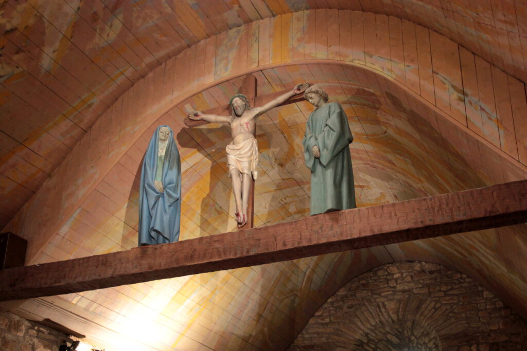 Jouissant d’une belle réputation, il multiplie les expositions de tableaux à l’international, répond à des commandes monumentales ou dessine des costumes de scène. Passé par l’abstraction, il a su apprécier l’action painting américaine, jouant d’une application directe de la couleur. Cette période qui semble ici une parenthèse dans sa carrière est cependant déterminante en ceci que le geste spontané a longtemps été une marque de Joël Dabin. Il s’est en effet attaché à produire des œuvres figuratives et symbolistes empreintes d’envolées libres. C’est ce qui ressort du décor verrier et pictural de l’église de Mouais (Loire-Atlantique) qui, réalisé en lien avec l’architecte des monuments historiques Charles Choisel et l’atelier de vitrail Latteux-Bazin, veut représenter une progression vers une image nécessairement idéalisée du Paradis. Dans une commune d’environ 350 habitants en 1969, un tel programme dénote d’autant plus que le sculpteur régionaliste breton Jean Fréour complète la poutre de gloire de représentations de Marie et saint Jean.
